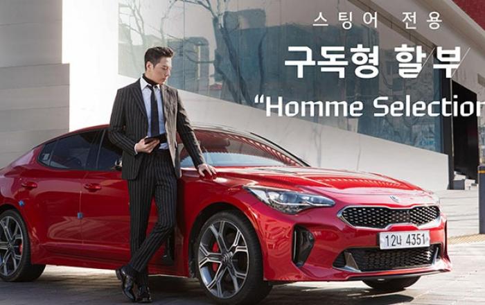 기아자동차㈜가 새로운 형태의 ‘구독형 할부 프로그램’을 선보인다.기아자동차는 프리미엄 퍼포먼스 세단 ‘스팅어’의 주 고객층인 2~40대 남성의 체감 가치 제고를 위해 ‘남성용 구독 서비스’를 결합시킨 업계 최초의 구독형 할부 프로그램 ‘옴므 셀렉션(Homme Selec