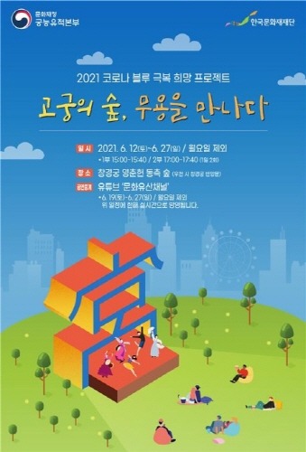 문화재청 궁능유적본부와 한국문화재재단은 코로나19 장기화로 지친 시민들에게 우리 전통문화 공연으로 문화생활의 기회를 제공하고자 오는 12∼27일까지 고궁 음악회 특별공연 '고궁의 숲, 무용을 만나다'를 창경궁 영춘헌 동측 숲에서 개최한다.