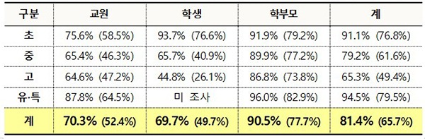 이 결과 2학기 등교 확대 추진에 대한 긍정적 응답은 보통 응답을 포함해 81.4%(매우 긍정 및 긍정 65.7%)로 나타났다. 설문 대상별로 학부모 90.5%, 교원 70.3%, 학생 69.7% 순이었다.