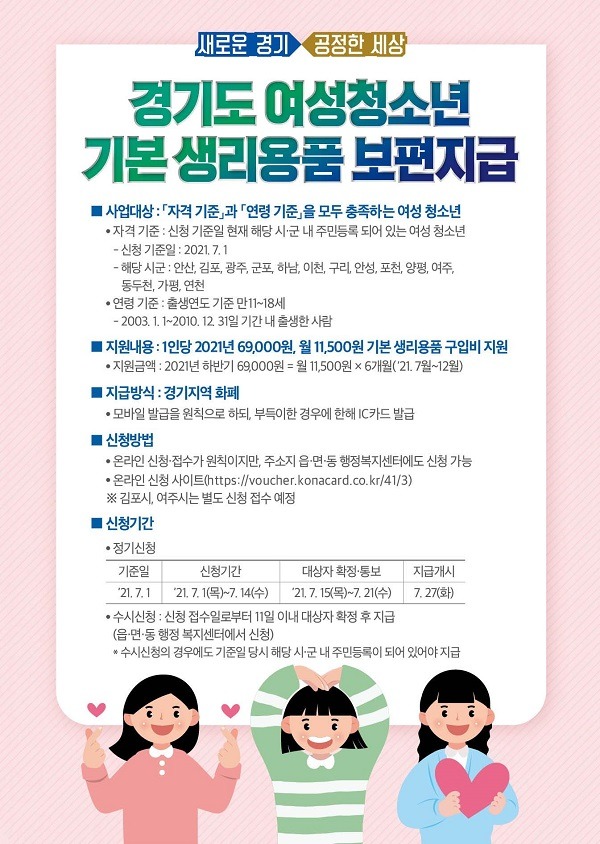 경기도가 7월부터 만 11~18세 여성청소년에게 1인당 월 1만1,500원의 생리용품 구입비를 지급하기 위해 7월 1일부터 지원 신청을 받는다.