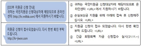 정부는 “전화 또는 문자 메시지를 통해 각종 지원금 신청을 받지 않으며, 신분증 등 개인정보도 요구하지 않음에 따라 이를 요구하는 행위에 이용자는 응하지 말아야 한다”며 “의심이 되거나 확인이 필요한 경우에는 지원금 지급 관련 정부기관에 직접 확인을 할 것”을 권고했다.