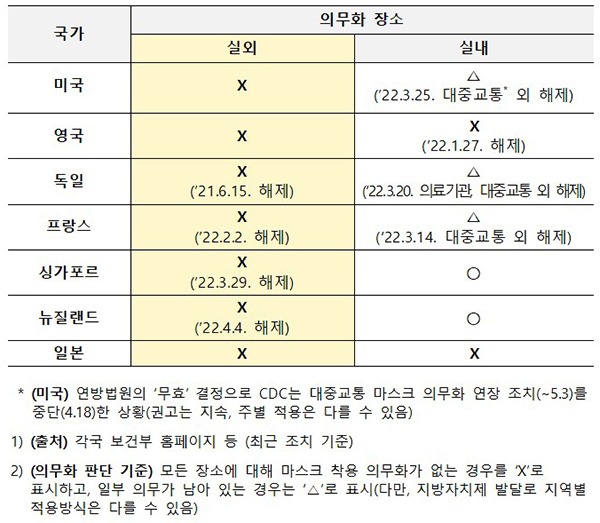 이와 관련해 해외에서도 대부분 실외 마스크 착용 의무는 부여하지 않거나, 싱가포르와 뉴질랜드 등 기존 의무 부여 국가에서도 정점을 지나 해제하는 추세이다.