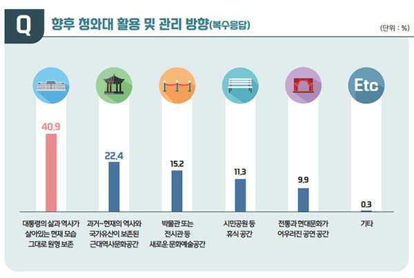 향후 청와대의 활용 및 관리방향을 묻는 질문에 대해서는 ‘대통령의 삶과 역사가 살아있는 현재 모습 그대로 원형 보존’이 40.9%로 가장 높게 나타났다. ‘과거~현재의 역사와 국가유산이 보존된 근대역사문화공간 조성’이 22.4%, ‘박물관 또는 전시관 등 새로운 문화예술공간 조성’이 15.2%로 그 뒤를 이었다.