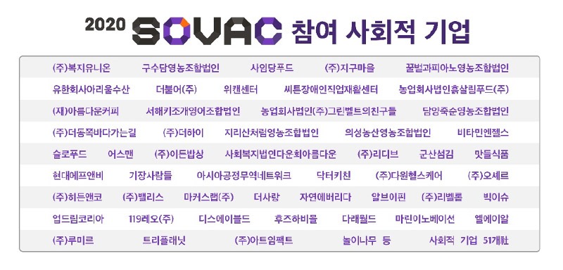 아울러 11번가는 ‘SOVAC2020’과 연계해 이달 25일까지 ‘SOVAC마켓 - 소비에 가치를 더하다”라는 기획전을 연다. ‘행복인플루언서’가 리뷰한 상품을 비롯해 다양한 사회적 기업 상품을 한 자리에서 선보이는 자리로, ▲사회혁신 ▲결식 아동 지원 ▲친환경 등 테마별 상품을 저렴하게 이용할 수 있는 할인 쿠폰도 제공한다.